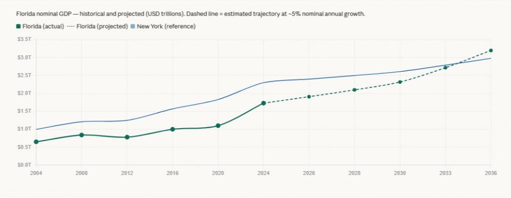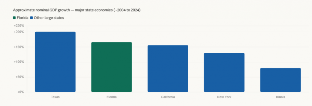 In the early 2000s, Florida’s nominal GSP was approximately $650 billion, placing the state fifth in the nation. By 2024, FRED data from the U.S. Bureau of Economic Analysis places Florida’s nominal GSP at $1,726,709.9 million — representing roughly 166% nominal growth over two decades. No income tax. A business-friendly regulatory environment. Relentless population growth. A deliberate diversification strategy that moved Florida far beyond tourism and retirement. All of it compounded, year after year, into the economy Florida has today.