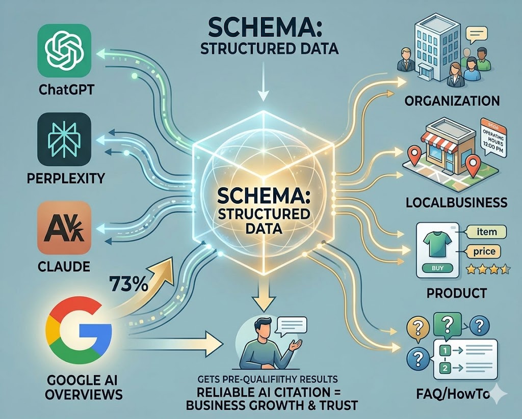 When a potential customer asks an AI engine about your industry, your services, or your geographic market, schema is what allows the AI to confidently cite your business by name. Without schema, even an excellent business website may be discounted as a citation source because the AI cannot extract verifiable facts safely. With schema, every relevant detail is delivered to the AI in a format it can use immediately.